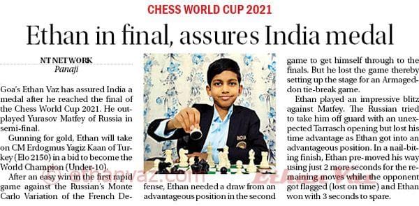 Goan chess sensation AIM Ethan Vaz has assured a medal for India at the World Cup 2021 Finals tournament by overcoming Yurasov Matfey of Russia in the semi-finals and securing his spot in the finals.
