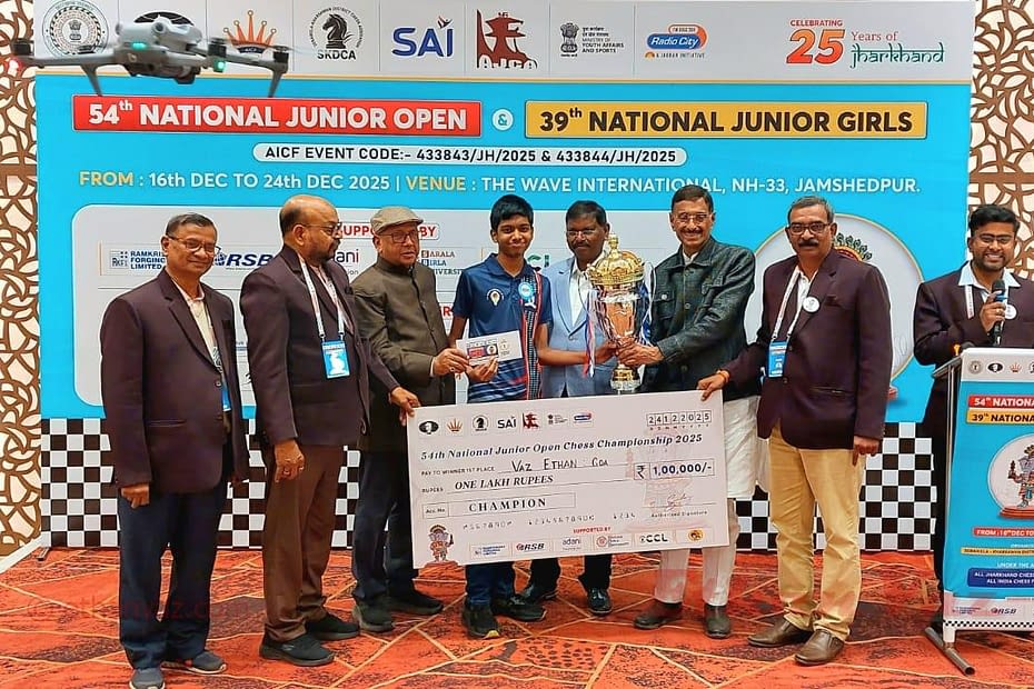 Goa’s IM Ethan Vaz scripted history by becoming the first ever Goan to win Gold at the National Junior Under-19 Chess Championship in the Open category, achieving the feat at just 14 years of age. Scoring an unprecedented 10.5 points in 11 rounds, Ethan’s dominating performance saw him finish a remarkable 1.5 points clear of the field. The championship was held in Jamshedpur from December 16 to 24, 2025.